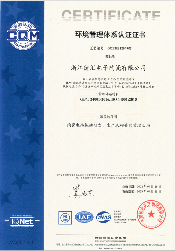 2022年4月22日,浙江德匯電子陶瓷有限公司正式通過ISO14001環(huán)境管理體系認證,并獲得證書。這標志著德匯在環(huán)境保護管理方面實現(xiàn)了國際化對接,綜合軟實力進入新軌道。
